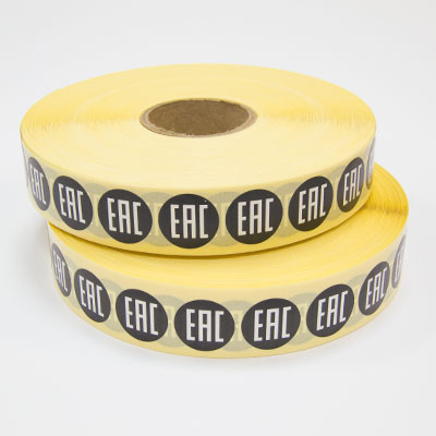 Размещать наклейки с таким знаком на своей продукции имеют право только изготовители, получившие так называемую "Декларацию соответствия". Сам знак "EAC" был разработан российским дизайнером Максимом Десятых и вошел в обращение в 2013 г. Согласно требованиям к знаку, он должен быть прямоугольной формы, причем ширина всех трёх букв должна равняться высоте каждой из них. Исходя из этого требования, был применен шрифт, содержащий узкие буквы с прямыми углами. Для того, чтобы знак был легко различим на любом цветном материале, регламентировано два цветовых решения наклеек: чёрные буквы на белом (светлом) фоне или белые буквы на чёрном фоне.