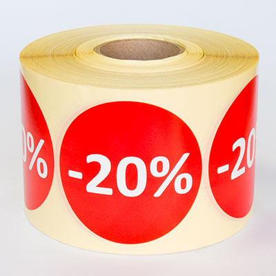 Наклейка " - 20% " отпечатана на высококачественной самоклеящейся бумаге FASSON на самом современном оборудовании, установленном в нашей типографии. Подобные наклейки сохраняют свои клеящие свойства в течение длительного времени. Производитель материала гарантирует срок службы - как минимум два года. Поэтому вы всегда сможете использовать безбоязненно оставшиеся наклейки на следующий сезон.