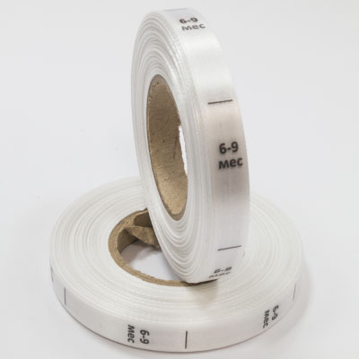 Размерник на белом сатине "6-9 мес" в рулоне. Намотка - 1 000 штук. Картонная втулка 40 мм.