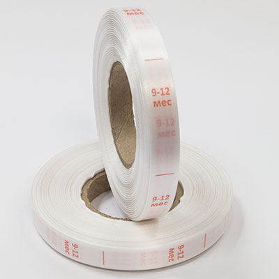 Размерник на белом сатине "9-12 мес розовый" в рулоне. Намотка - 1 000 штук. Картонная втулка 40 мм.