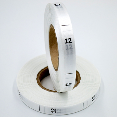 Размерник на белом сатине "12" в рулоне. Намотка - 1 000 штук. Картонная втулка 40 мм.