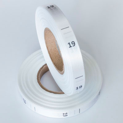 Размерник на белом сатине "19" в рулоне. Намотка - 1 000 штук. Картонная втулка 40 мм.