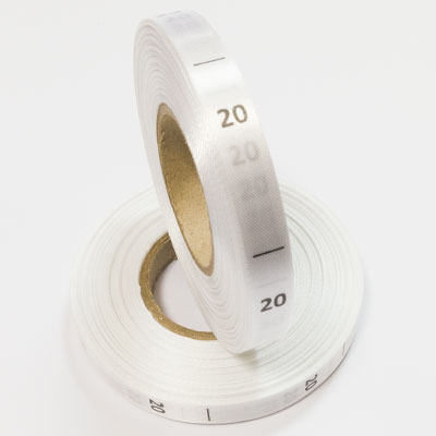 Размерник на белом сатине "20" в рулоне. Намотка - 1 000 штук. Картонная втулка 40 мм.
