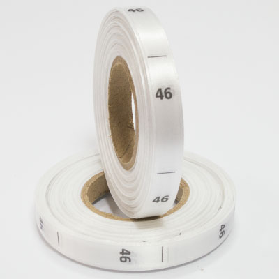 Размерник на белом сатине "46" в рулоне. Намотка - 1 000 штук. Картонная втулка 40 мм.