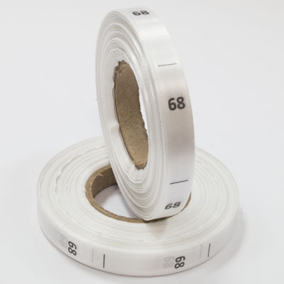 Размерник на белом сатине "68" в рулоне. Намотка - 1 000 штук. Картонная втулка 40 мм.