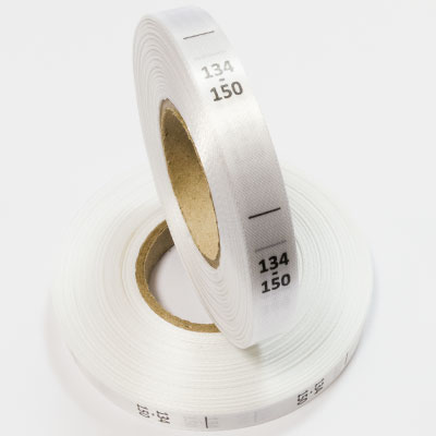 Размерник на белом сатине "134-150" в рулоне. Намотка - 1 000 штук. Картонная втулка 40 мм.