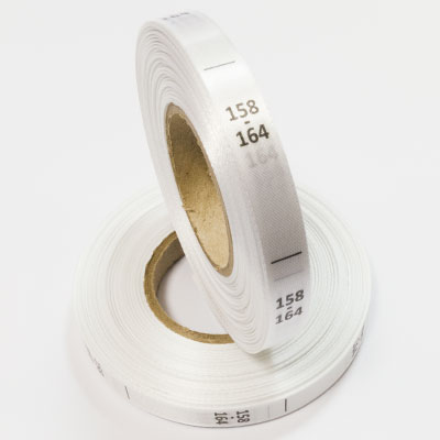 Размерник на белом сатине "158-164" в рулоне. Намотка - 1 000 штук. Картонная втулка 40 мм.